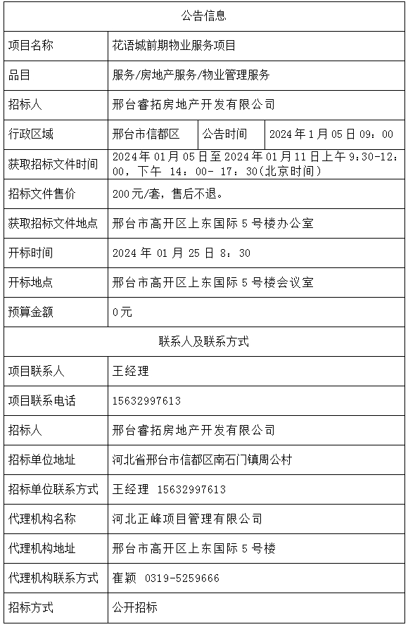 1.1本招标项目花语城前期物业服务项目,业主为邢台睿拓房地产开发有限公司,招标人为邢台睿拓房地产开发有限公司,项目已具备招标条件,现对该项目进行公开招标。
