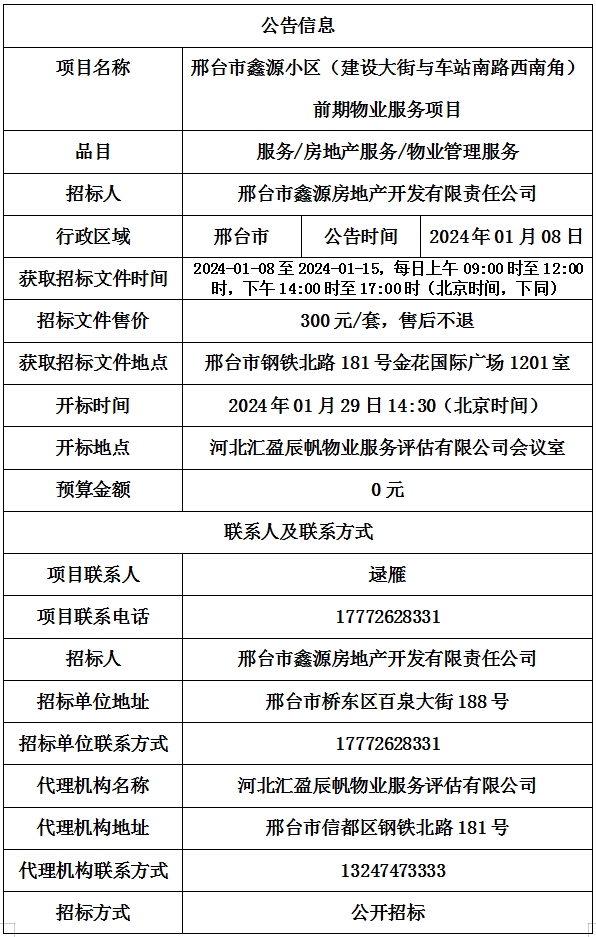 1.1本招标项目邢台市鑫源小区(建设大街与车站南路西南角)前期物业服务项目业主为邢台市鑫源房地产开发有限责任公司,招标人为邢台市鑫源房地产开发有限责任公司,项目已具备招标条件,现对该项目进行公开招标。