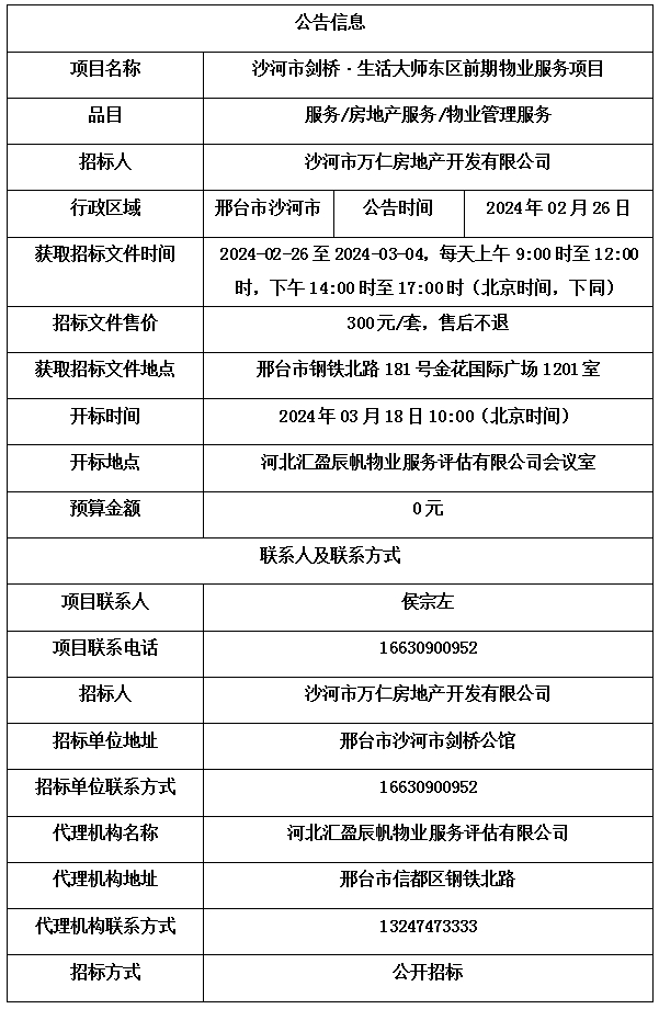 1.1本招标项目沙河市剑桥·生活大师东区前期物业服务项目 已由/以/批准建设,项目业主为沙河市万仁房地产开发有限公司 ,资金来源为自筹资金,出资比例为100%,招标人为沙河市万仁房地产开发有限公司 ,项目已具备招标条件,现对该项目进行公开招标。