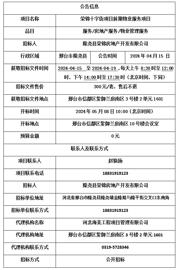 本招标项目荣锦十字街项目前期物业服务项目 已由/以/批准建设,项目业主为隆尧县荣锦房地产开发有限公司,资金来源为自筹资金,出资比例为100%,招标人为隆尧县荣锦房地产开发有限公司,项目已具备招标条件,现对该项目进行公开招标。