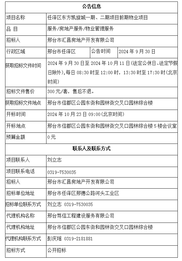 本招标项目任泽区东方凯旋城一期、二期项目前期物业项目已由/以/批准建设,项目业主为邢台市汇昌房地产开发有限公司,资金来源为自筹资金,出资比例为100%,项目已具备招标条件,现对该项目进行公开招标。