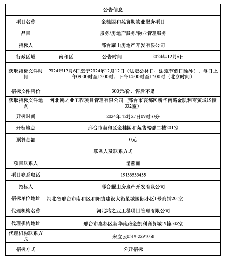 本招标项目 金桂园和苑前期物业服务项目已由/以/批准建设,项目业主为邢台耀山房地产开发有限公司,资金来源为自筹资金,出资比例为100% ,招标人为邢台耀山房地产开发有限公司。项目已具备招标条件,现对该项目进行公开招标。