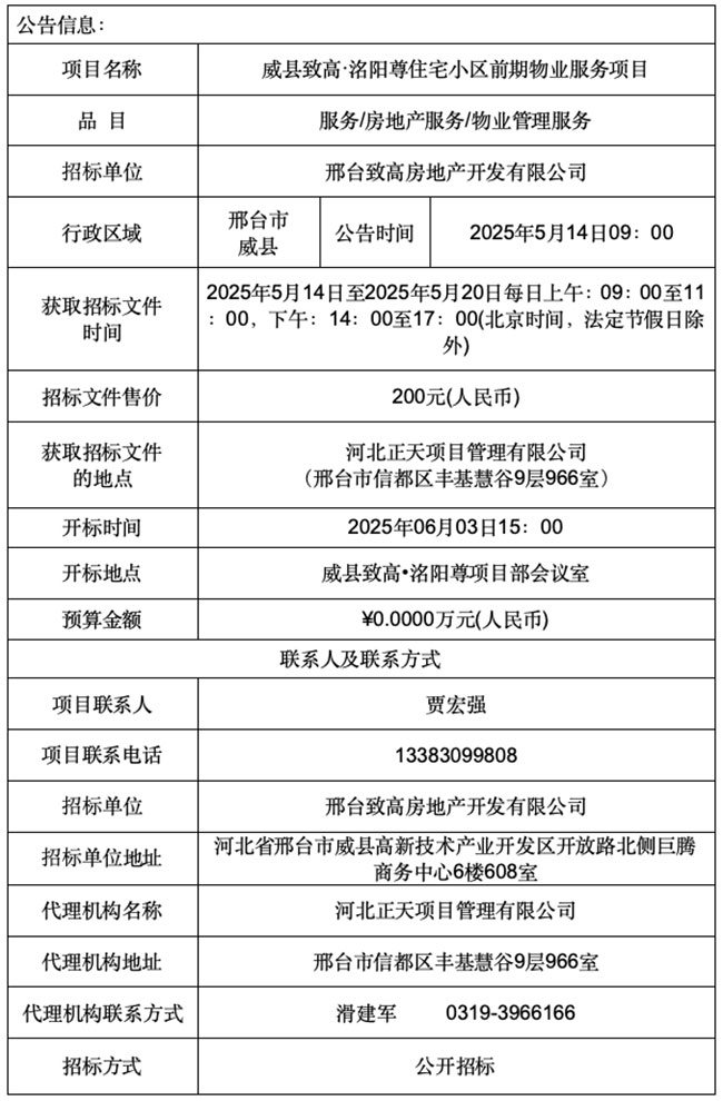 本招标项目威县致高·洺阳尊住宅小区前期物业服务项目已由/以/批准建设,项目业主为 邢台致高房地产开发有限公司,资金来源为 自筹资金,出资比例为 100%,招标人为邢台致高房地产开发有限公司,项目已具备招标条件,现对该项目进行公开招标。