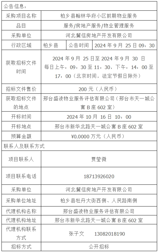 本招标项目柏乡县翰林华府小区前期物业服务项目 已由 / 以 / 批准建设,项目业主为河北冀信房地产开发有限公司,建设资金来自自筹,出资比例为 100%,招标人为河北冀信房地产开发有限公司,项目已具备招标条件,现对该项目进行公开招标。