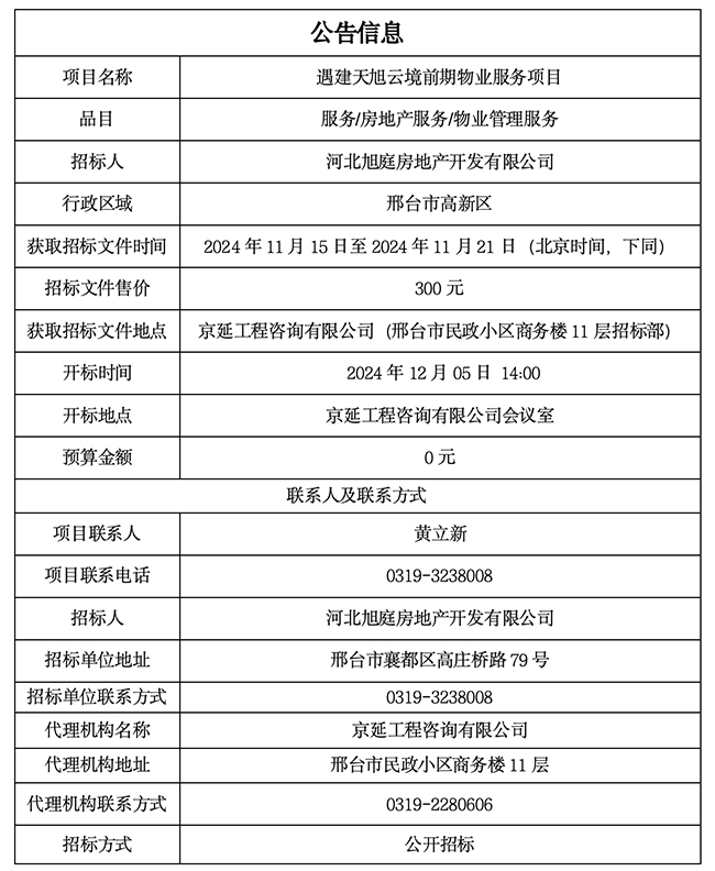 本招标项目遇建天旭云境前期物业服务项目已由/以/批准建设,项目业主为 河北旭庭房地产开发有限公司,资金来源为 自筹资金,出资比例为 100%,招标人为河北旭庭房地产开发有限公司,项目已具备招标条件,现对该项目进行公开招标。
